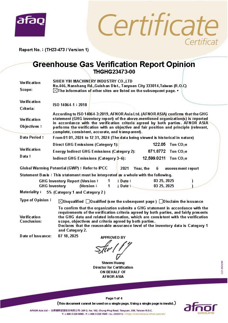 SEYI Machinery es muy consciente de la gravedad del calentamiento global. Con el fin de cumplir con su responsabilidad corporativa de protección ambiental, reducir las emisiones de gases de efecto invernadero generadas por las operaciones de la empresa e impactar el medio ambiente y el clima causado por el calentamiento global, lanzará en 2023 el inventario de gases de efecto invernadero ISO 14064 para el año base 2022 con SEYI. Taiwán como frontera se basa en los cinco procesos principales de "frontera, fuente, cálculo, presentación de informes e inspección" para realizar un inventario y establecimiento de inventario sistemático y consistente, y ha sido aprobado por AFNOR International y llevó a cabo la verificación con un objetivo y postura y principios imparciales (relevancia, integridad, coherencia, precisión, transparencia) y finalmente obtuvo el certificado de inventario ISO 14064-1:2018.